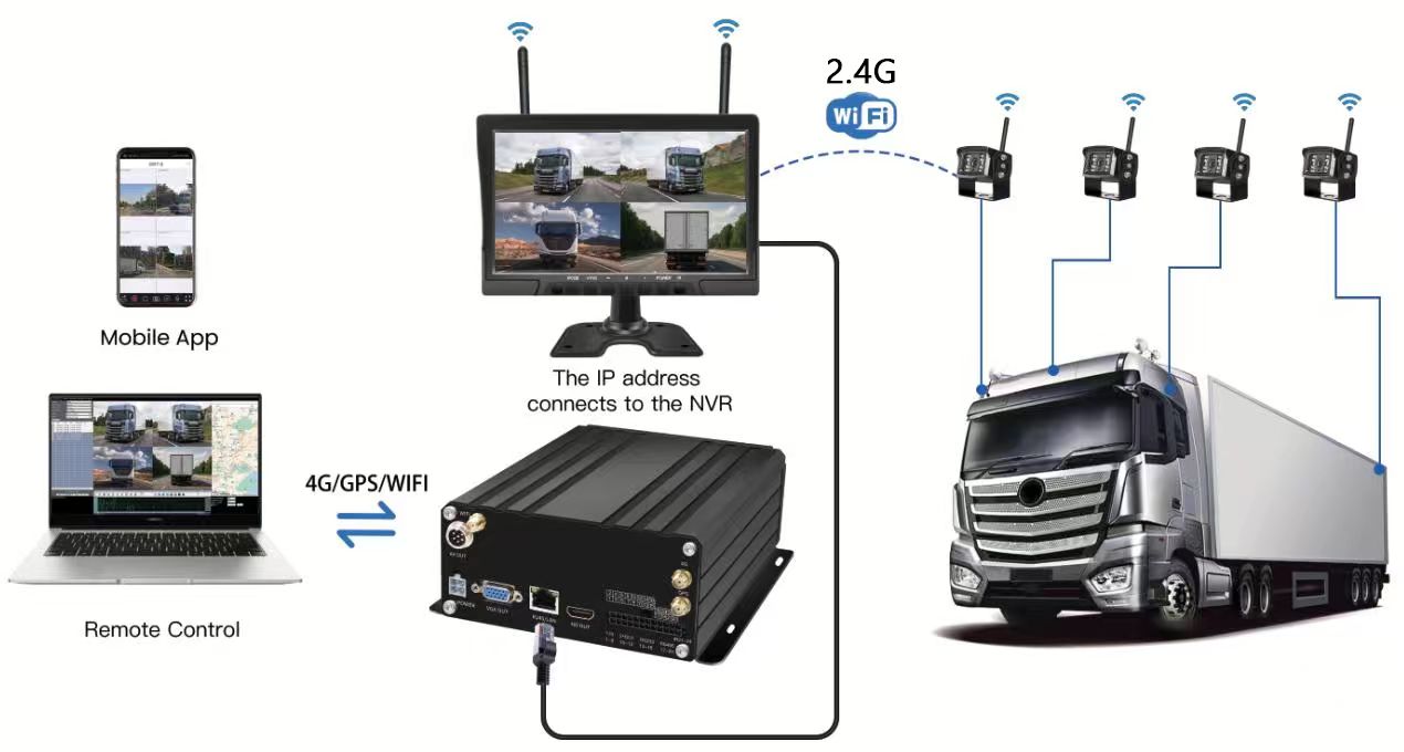 Camera quan sát trong cabin giám sát tài xế AHDHệ thống NVR di động HDD không dây 10,1 inch 4CH Carleader, một hệ thống NVR di động tiên tiến được thiết kế để quản lý đội xe. Hệ thống sử dụng 4 camera IP không dây ghép nối với màn hình wireelss 10,1 inch qua tín hiệu 2,4 GHz, sau đó kết nối màn hình và NVR bằng đầu nối RJ45. không cần thêm vấn đề nối dây, hiệu quả hơn cho việc lắp đặt và quản lý đội xe.