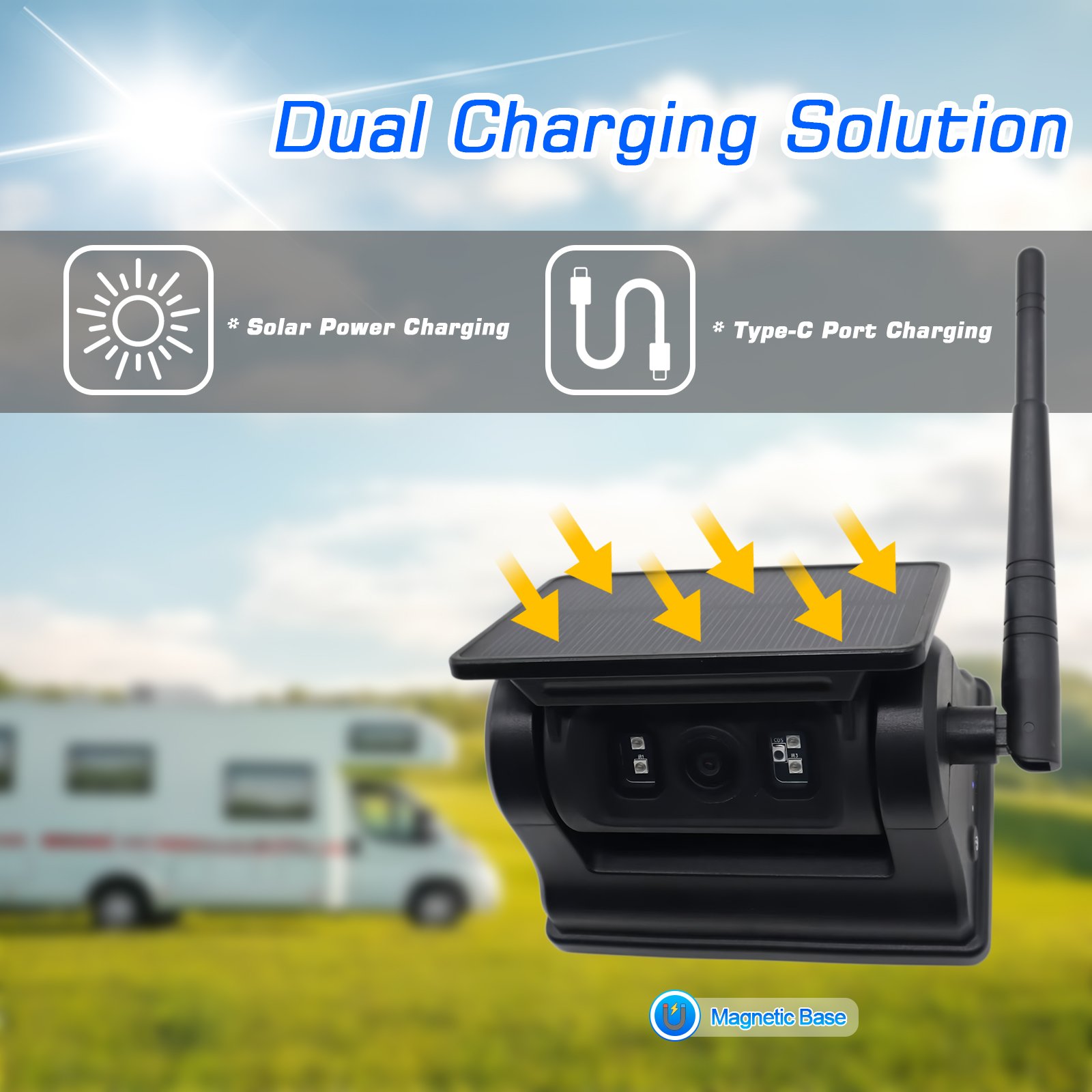 2. Máy ảnh có khả năng chạy bằng năng lượng mặt trời và có pin có thể nạp lại dung lượng lớn 10500mAh tích hợp. Bảng điều khiển năng lượng mặt trời thân thiện với môi trường và có thể cung cấp năng lượng cho camera RV không dây 1080p chạy bằng năng lượng mặt trời và pin có thể được sạc qua giao diện loại C. Pin có thể sạc lại đảm bảo độ tin cậy 24/7, ngay cả trong những ngày nhiều mây. Đảm bảo rằng camera dự phòng không dây năng lượng mặt trời WiFi có đủ nguồn điện.
