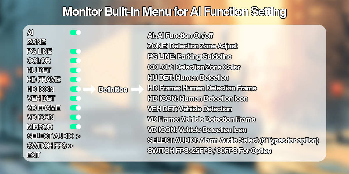 trưởng xeHệ thống giám sát phát hiện điểm mù AI BSD 7 inch Hỗ trợ hiệu chỉnh AI, một giải pháp camera AI hỗ trợ phát hiện người đi bộ, phát hiện phương tiện, tăng cường đáng kể độ an toàn khi lái xe, giám sát với menu hiệu chỉnh AI tích hợp, cho phép người dùng điều chỉnh khu vực phát hiện, bật/tắt hiển thị màu vùng phát hiện, loại âm thanh cảnh báo, hiển thị biểu tượng phương tiện và người đi bộ, lựa chọn đối tượng phát hiện, v.v.