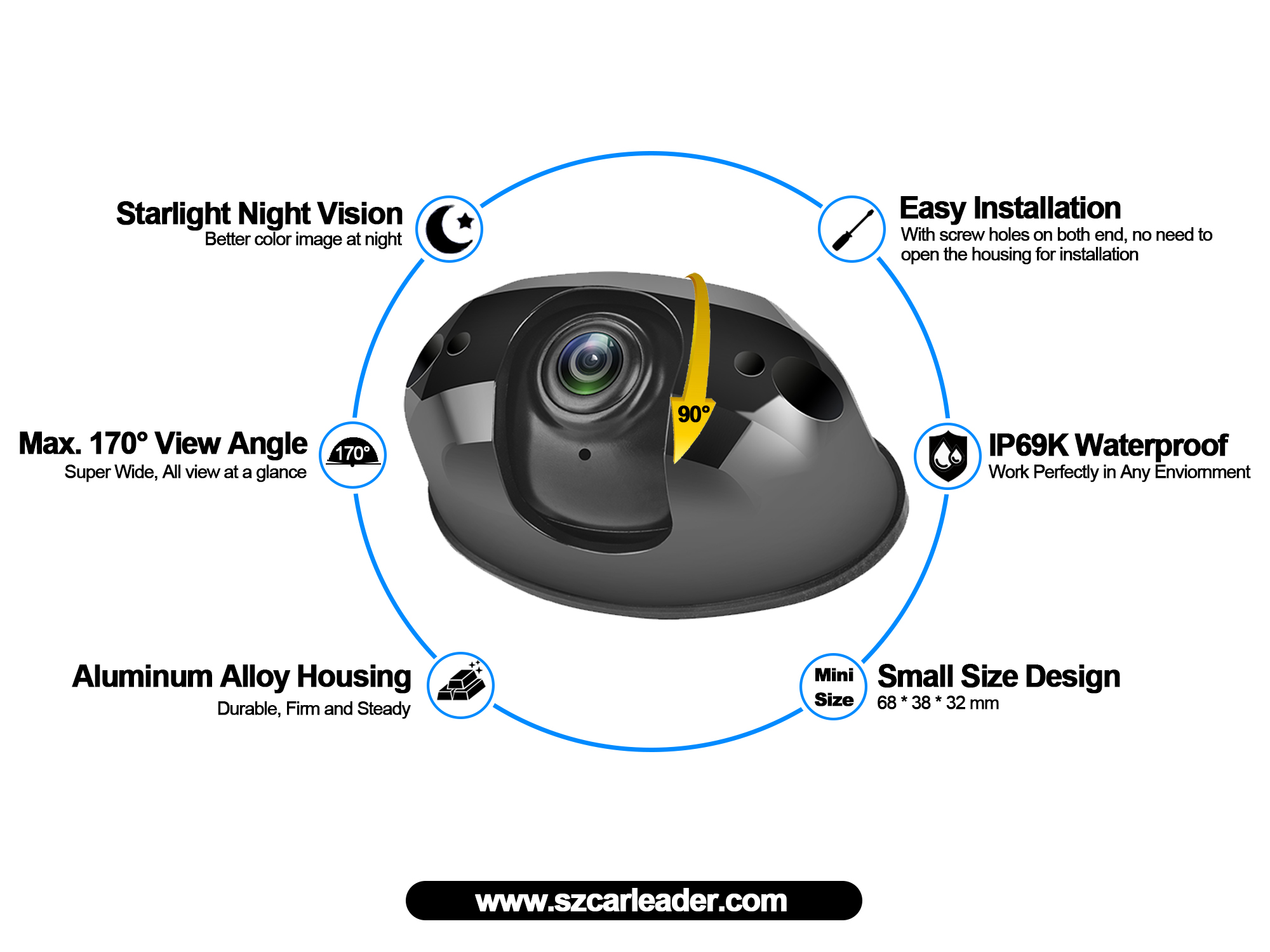 Camera dự phòng hạng nặng chống nước góc rộng 170 độ AHD cung cấp cho người lái hình ảnh rõ ràng theo thời gian thực trong quá trình lái xe. Góc siêu lớn lên tới 170°, giúp người lái cung cấp phạm vi giám sát rộng hơn, để người lái có thể theo dõi môi trường xung quanh xe mà không có bất kỳ điểm mù nào