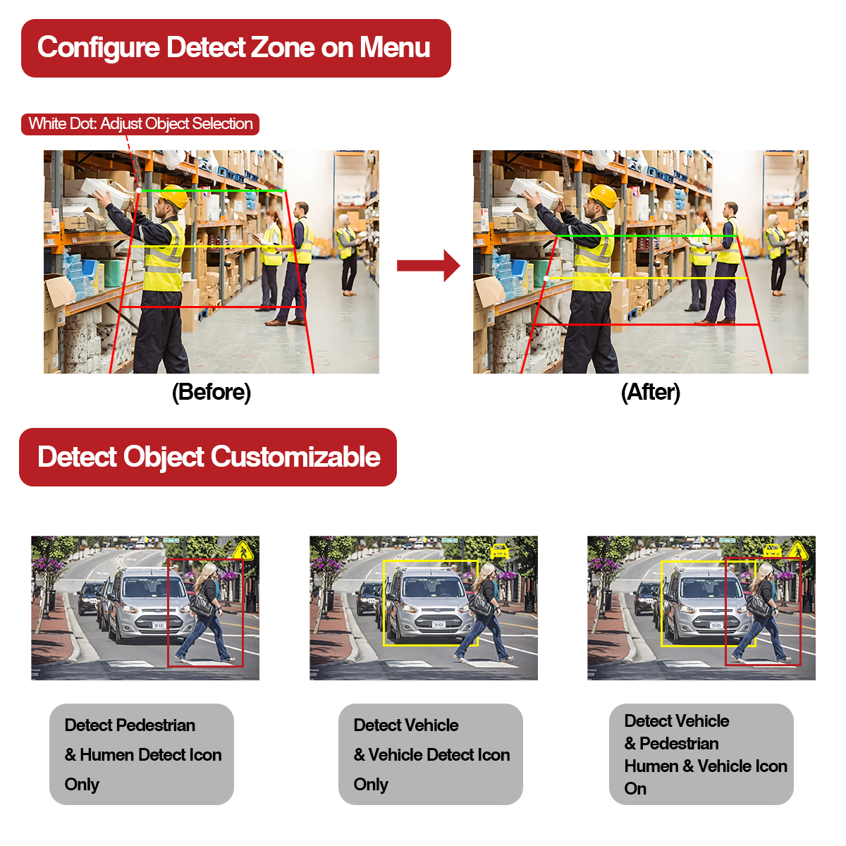 Camera AI này có chức năng đèn cảnh báo tích hợp, màu sáng sẽ thay đổi thành màu tương ứng khi đối tượng phát hiện đi vào khu vực phát hiện khác (Đỏ, Vàng, Xanh lục). Đồng thời tích hợp tính năng báo động để cảnh báo người đi bộ xung quanh và phương tiện đang đến gần xe của bạn.