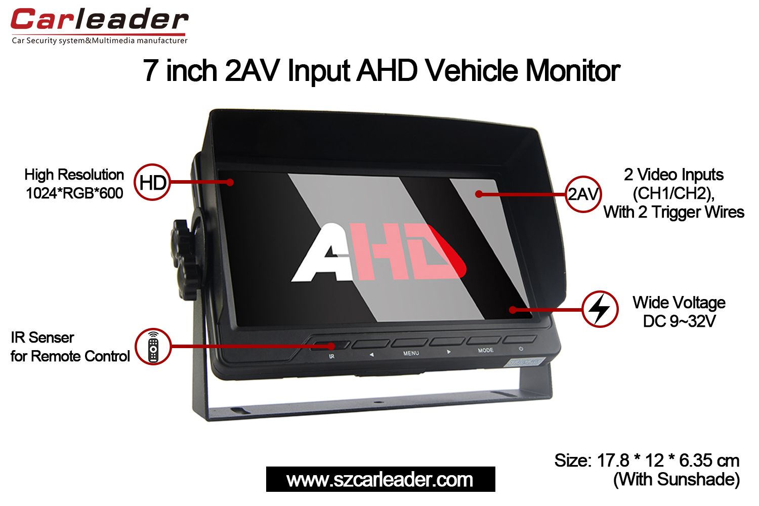Màn hình đầu vào Carleader 7 inch AHD 2CHkết hợp độ tin cậy, sự rõ ràng và tính linh hoạt trong một thiết kế nhỏ gọn và bền bỉ, khiến nó trở thành sự lựa chọn tuyệt vời cho nhu cầu giám sát phương tiện chuyên nghiệp và cá nhân.