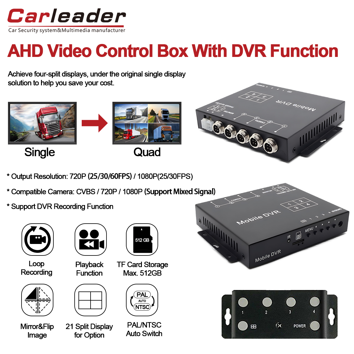 Nâng cao hệ thống giám sát xe vớiCarleader 1080P AHD Bộ xử lý video hiển thị chia đôi hỗ trợ quay video, hộp chia video 4CH đa năng được tích hợp khả năng ghi DVR tiên tiến. Được thiết kế để giám sát độ phân giải cao, linh hoạt và đáng tin cậy, thiết bị nhỏ gọn này lý tưởng cho việc quản lý đội xe, phương tiện an ninh hoặc bất kỳ ứng dụng nào yêu cầu hệ thống ghi và hiển thị đầu vào nhiều camera.