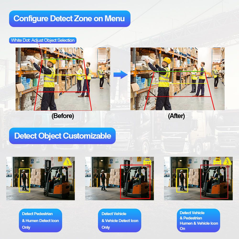 Phát hiện được hỗ trợ bởi AI: Thuật toán AI tiên tiến xác định chính xác người đi bộ và phương tiện trong thời gian thực, đảm bảo an toàn chủ động cho các phương tiện thương mại, máy móc hạng nặng và hoạt động của đội xe.