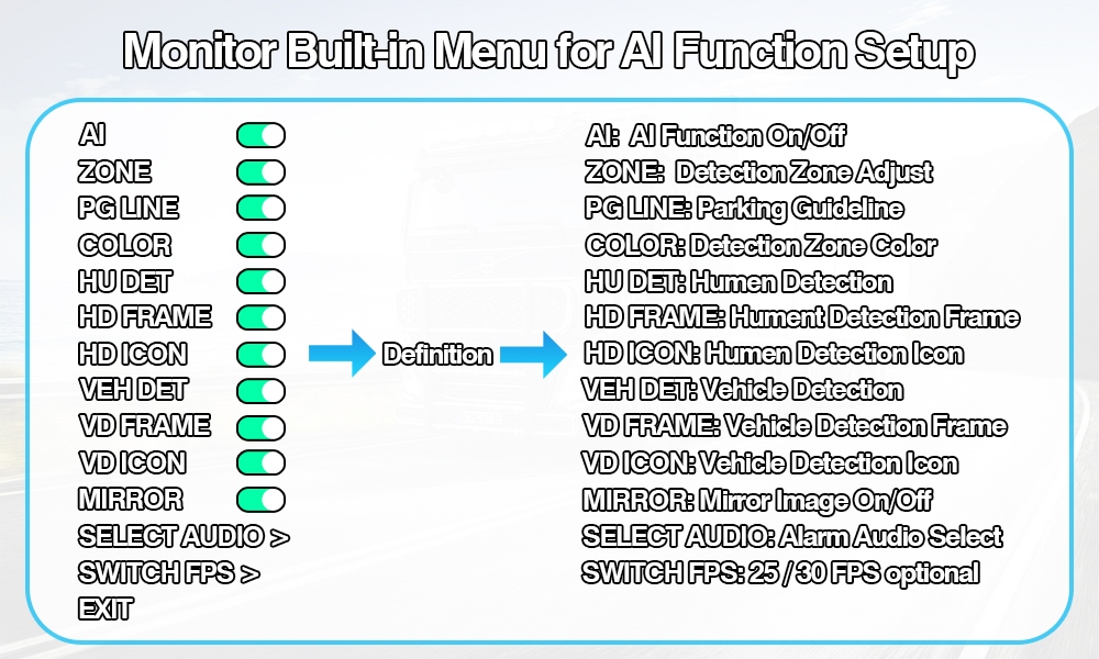 Nâng cao sự an toàn cho xe của bạn vớiHệ thống camera phát hiện điểm mù Carleader AI Tích hợp đèn cảnh báo đổi màu—một sự tiên tiếnGiải pháp AI do Carleader sản xuất, được thiết kế để phát hiện người đi bộ và phương tiện, đồng thời đưa ra cảnh báo bằng âm thanh và hình ảnh trực quan để ngăn ngừa va chạm.